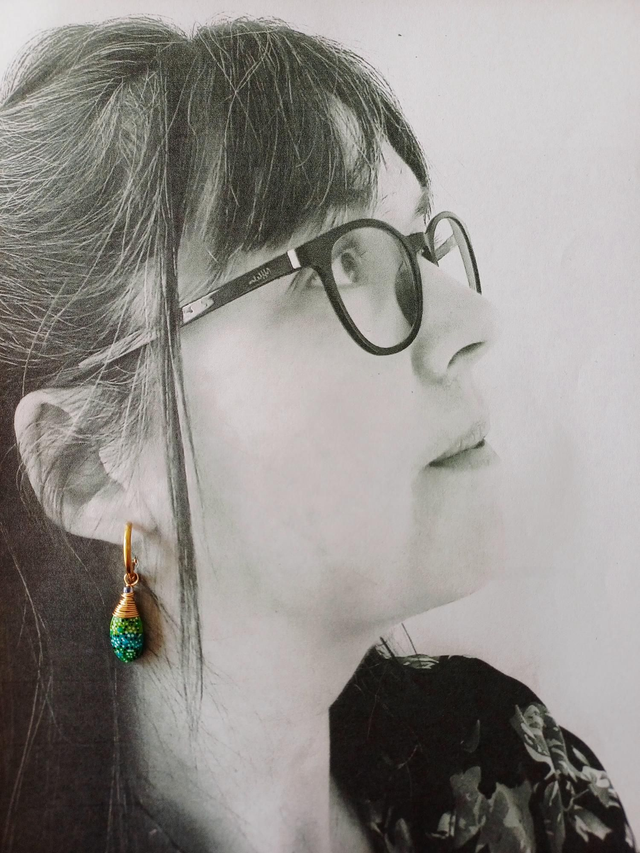 Créoles interchangeables réalisées avec une pampille en graines de potimarron sur un motif en R/V.